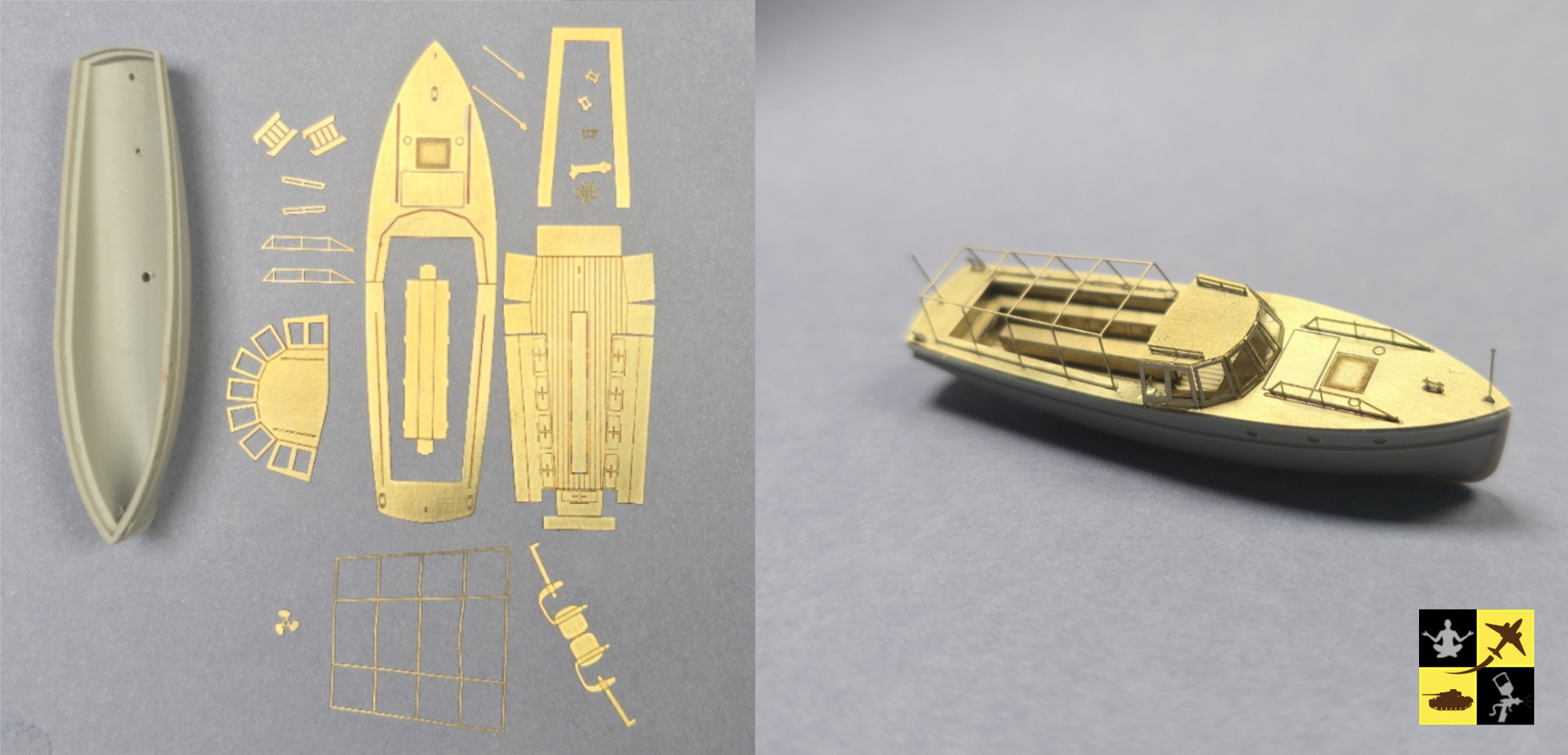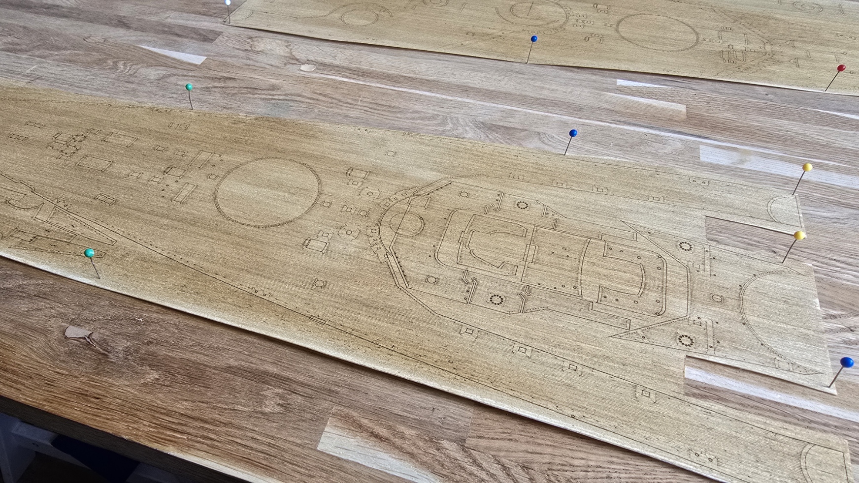 Le montage débute par une étape structurante : la pose du pont en bois issu du set Pontos. Le Bismarck étant doté d’un pont en teck, un travail spécifique de mise en couleur sera réalisé afin de restituer au mieux les nuances naturelles de ce bois, entre tons chauds et variations subtiles liées à son exposition en mer. Cette phase initiale permettra de poser les bases visuelles du modèle et d’assurer une cohérence réaliste pour l’ensemble du projet.