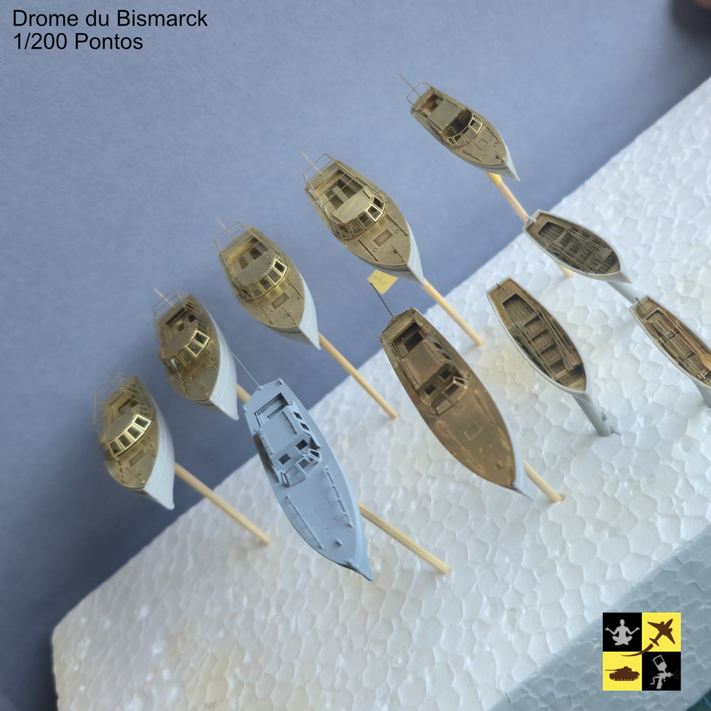 Pendant le direct, nous avons monter la "drome" du Bismarck, c'est à dire l'ensemble des petites embarcations. Ca n'a pas été une mince affaire, pas moins de 21 très petites pièces en PE par embarcation !