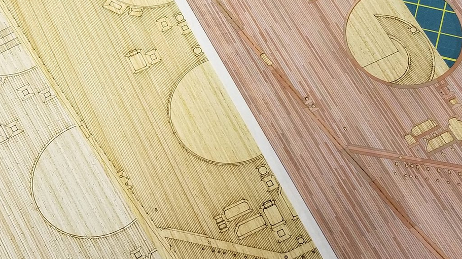 Le pont en bois proposé par Pontos se distingue par un niveau de finesse remarquable. Réalisé en bois véritable, il est découpé au laser avec une précision qui permet de reproduire fidèlement le tracé des lames, les ouvertures techniques et l’agencement spécifique du pont du Bismarck. La gravure, très subtile, suggère parfaitement les séparations entre les planches sans effet exagéré, ce qui renforce le réalisme à cette échelle. L’ensemble est conçu pour s’ajuster directement sur le pont plastique du kit Trumpeter, avec un support adhésif facilitant la mise en place. Au-delà de l’aspect pratique, c’est surtout la texture naturelle du bois qui apporte une vraie plus-value visuelle, en captant la lumière et en offrant une base idéale pour un travail de patine visant à reproduire l’aspect du teck exposé aux conditions maritimes.