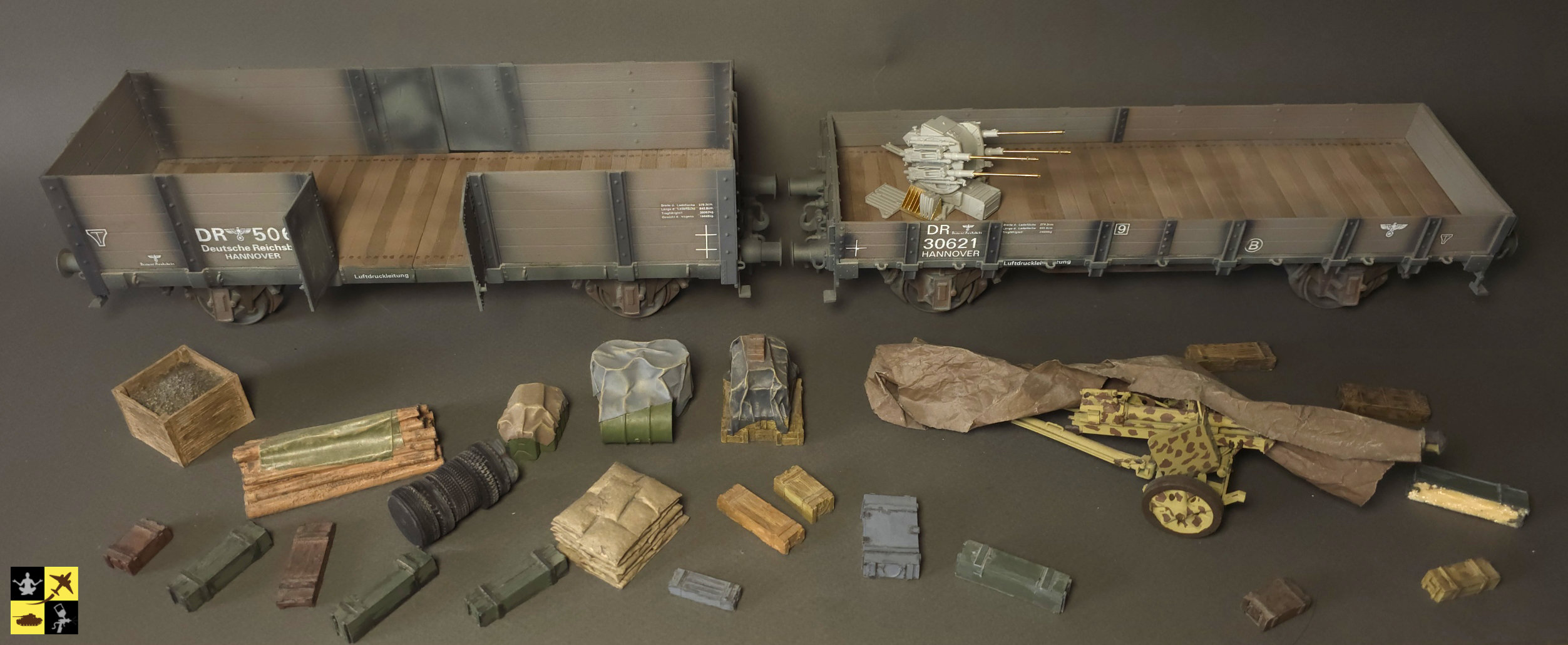 J'ai reçu par colis les 2 pièces réalisées par Didier & Alain.V, un superbe SdKFz.7 pour Didier et un wagon à bords moyens par Alain. Ils ont également peints quelques figurines et accessoires que je n'ose pas encore mettre en place, je dois attendre que le diorama soit un peu plus avancé. Les pièces sont magnifiques ! Merci les copains !