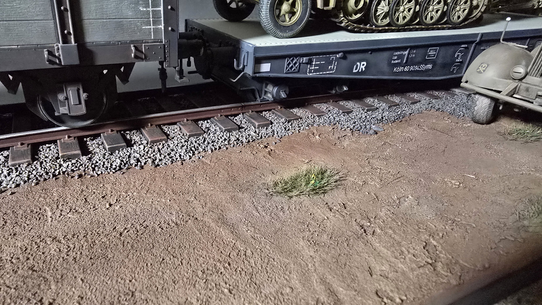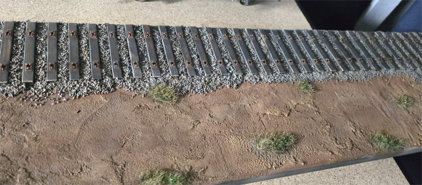 Coté Diorama, comme vous pouvez le voir sur les directs, j'ai peint un par un les traverses avec un gris acrylique très sombre, puis les parties métalliques sur les traverses (celle qui aident à maintenir les rails en place...) en couleur rouille acrylique trés diluée. Pour le sol, peinture Tamiya Flat Earth à l'aérographe, pour l'herbe, toujours à l'aéro, c'est un mélange de Dark Yellow, de Buff et de vert. Une fois bien sec, j'ai drybrushé en gris clair le gravier puis en Buff le sol. Le lendemain, un jus de TOB (Terre d'Ombre Brulée) sur l'ensemble, je vais maintenant laissé sécher le tout quelques jours...