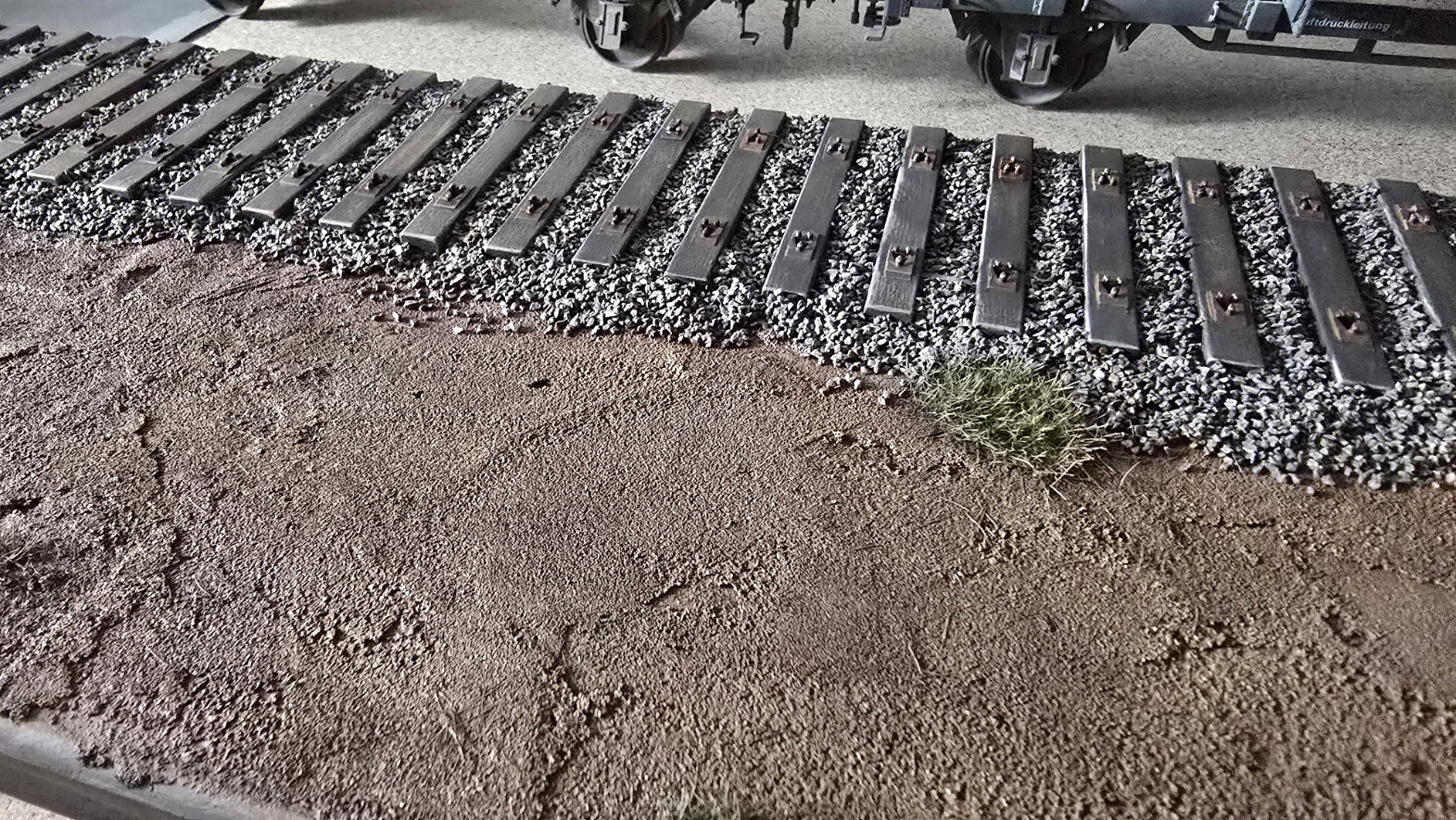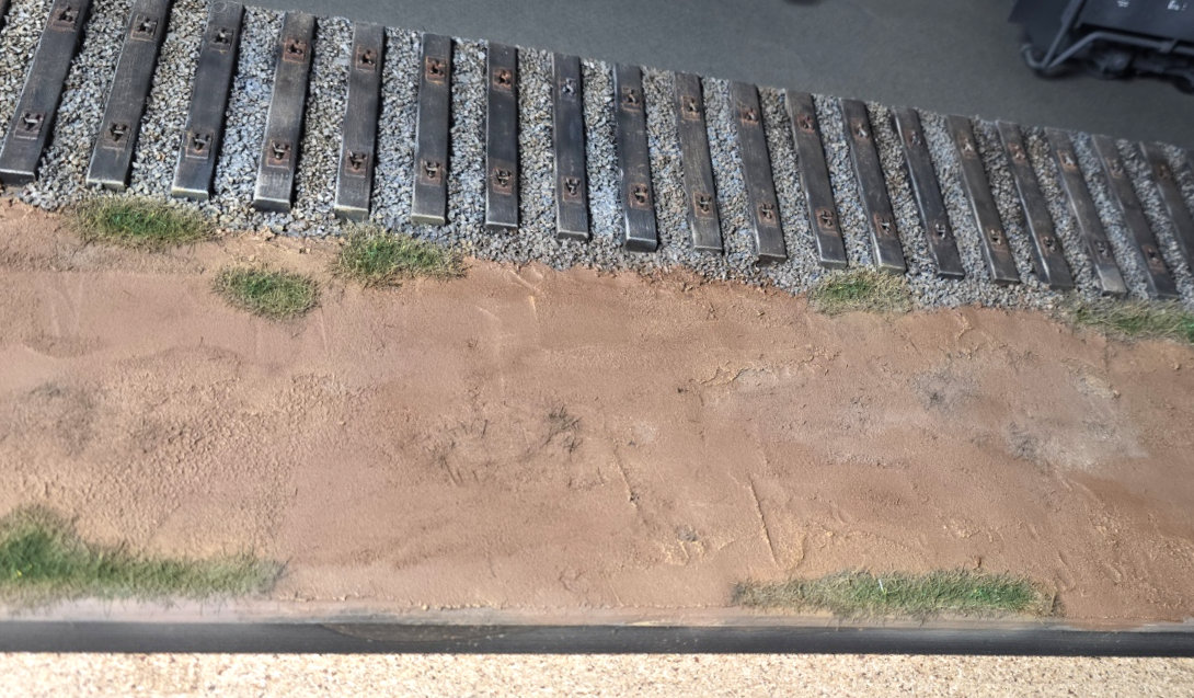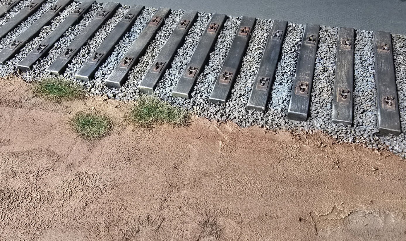Une fois le tout bien sec, je déposerai du ballast entre chaque traverse, je le fixerai avec le même mélange magique… puis j’attaquerai la mise en peinture. Plus simple, plus efficace, et à mon avis, bien plus clean